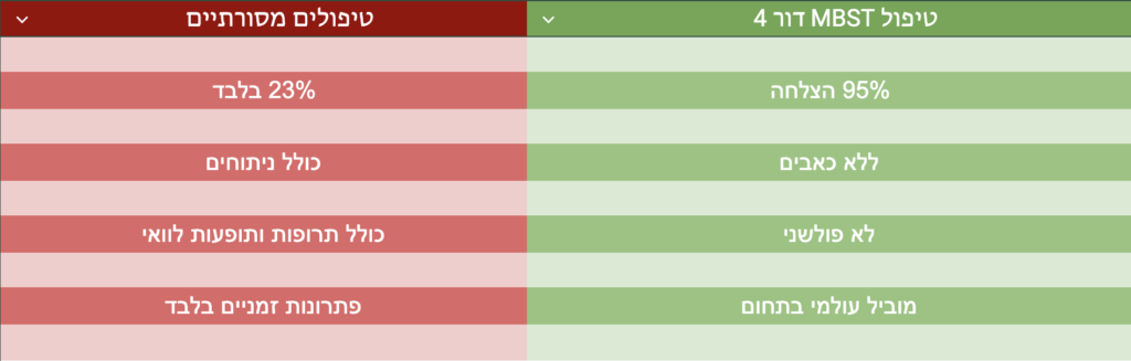 הטיפול בטכנולוגיית MBST דור 4 אינו כואב כלל, ואין לו תופעות לוואי. מדובר בטיפול לא פולשני ובטוח לחלוטין, המומלץ על ידי רופאים ומטופלים רבים.